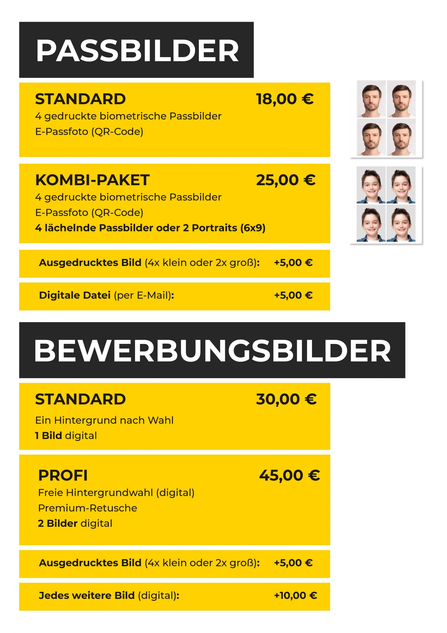 Da sich der Aufwand für uns kaum Unterscheidet, ob wir ein Passbild oder sechs Passbilder produzieren, können wir leider keine einzelnen Passbilder anbieten. Für diesen Fall haben wir aber auch unser Kombi-Paket, mit dem Sie für einen geringen Aufpreis zusätzlich noch “Freundliche Passbilder” erhalten, die sich hervorragend zum Verschenken oder zum Festhalten des aktuellen Aussehens eignen.
